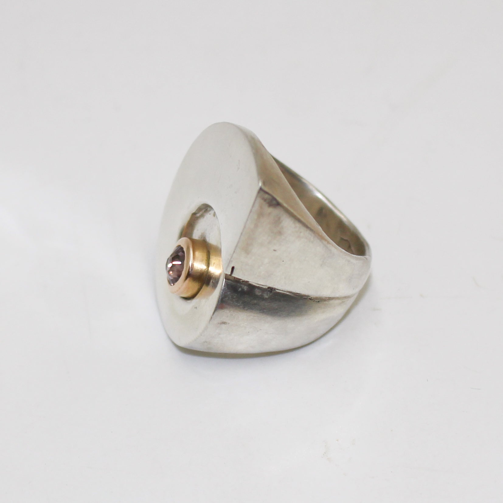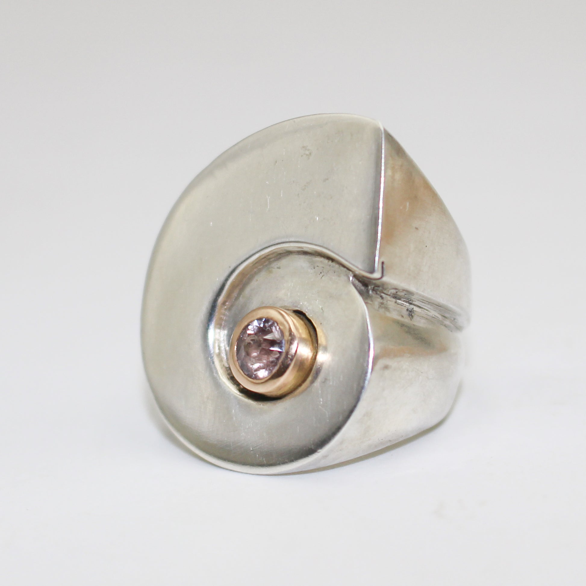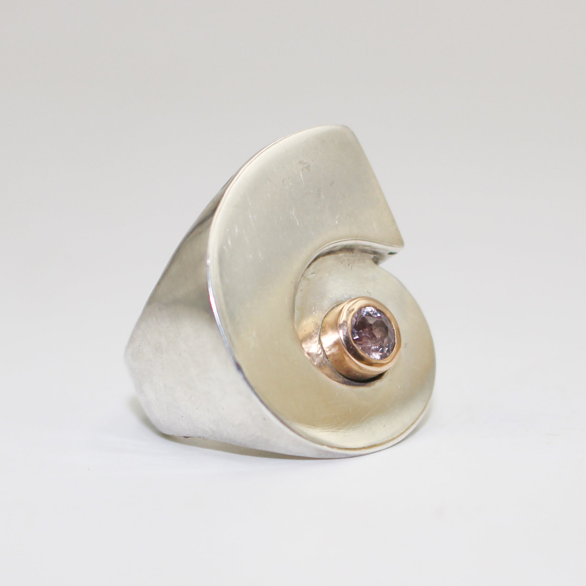 Inspired by ammonites and spirals in nature. Hand-carved signet weighing one full oz of sterling silver, with a radiant pink tourmaline in a 14k gold setting. Size 6.5, can be sized up to a 7 if needed.
