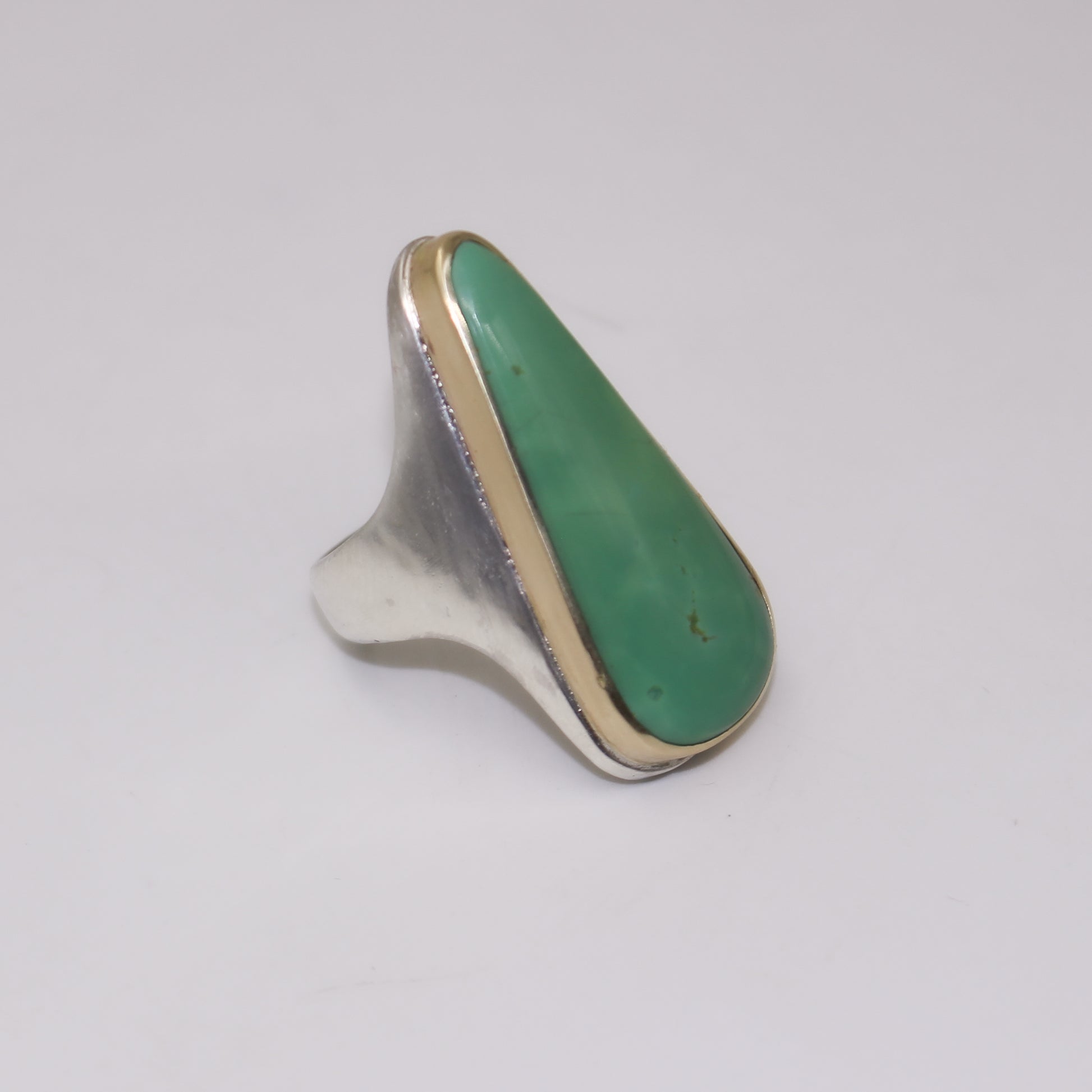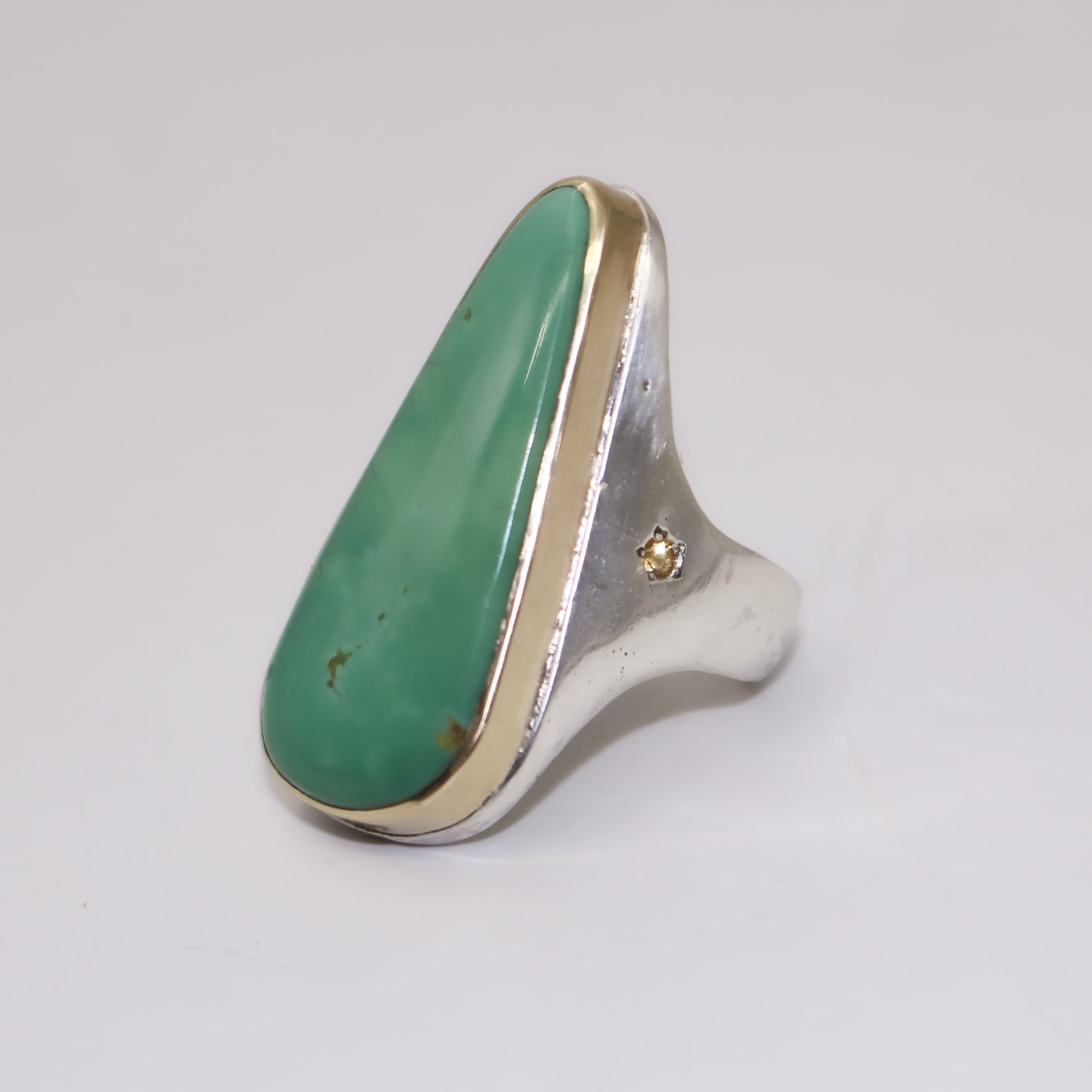 A heavy sterling silver signet with turquoise set in a 10k yellow gold bezel; Yellow tourmaline accent stone set into one side. Aspen energy.