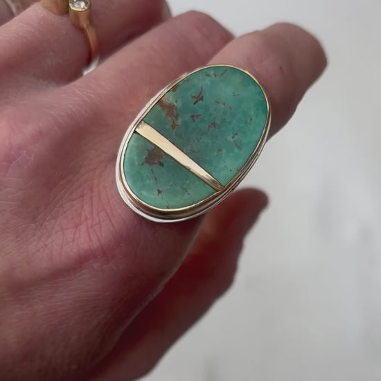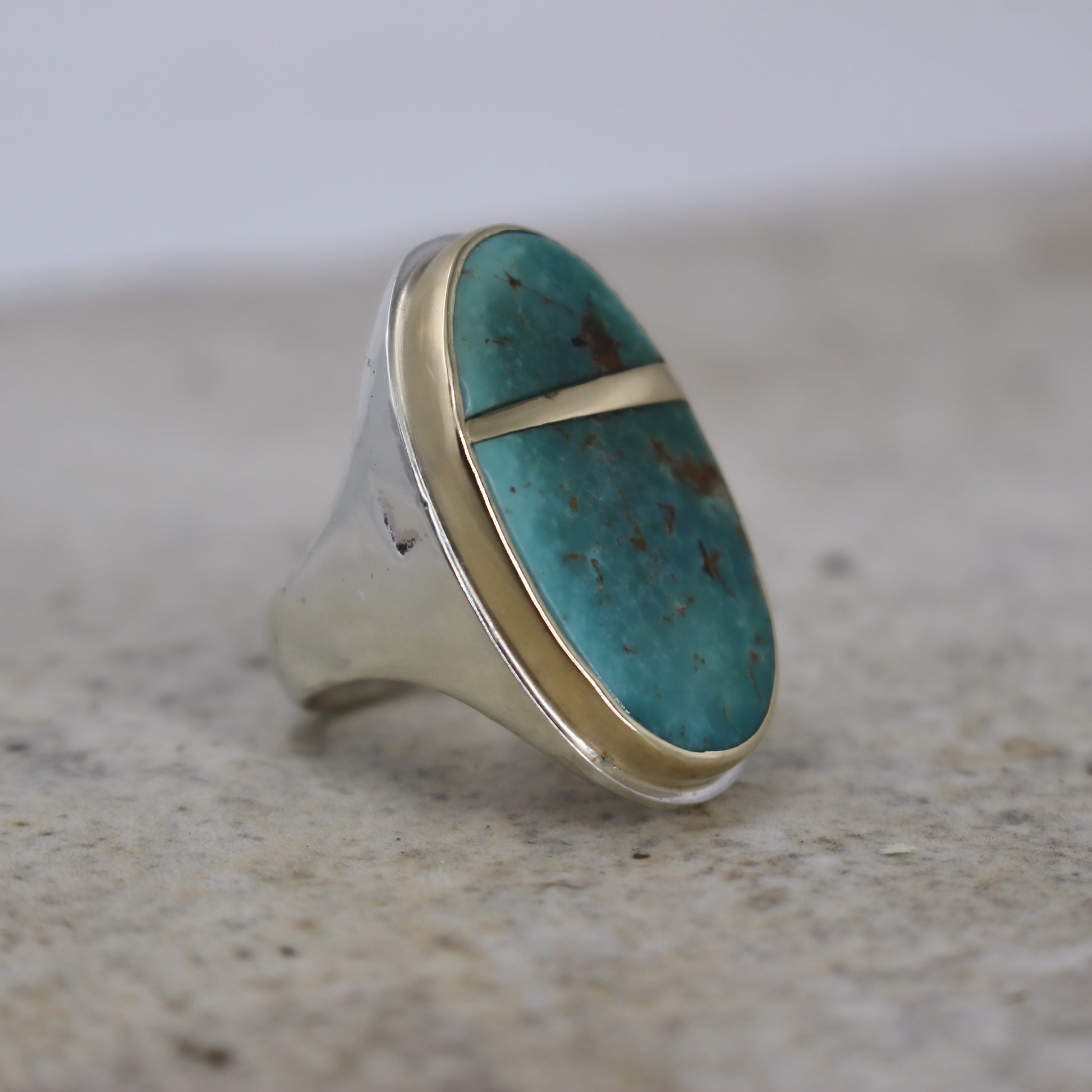 The chunkiest sterling silver signet with royston turquoise- inset with 14ky gold accent, set in a 14k yellow gold bezel.