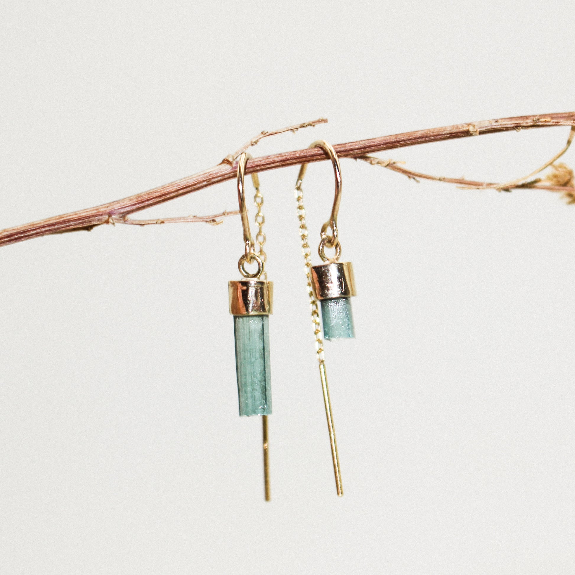 Beautifully rough around the edges and at the same time delicate. Raw tourmaline set in 10k gold, on 14k threaders. One of a kind