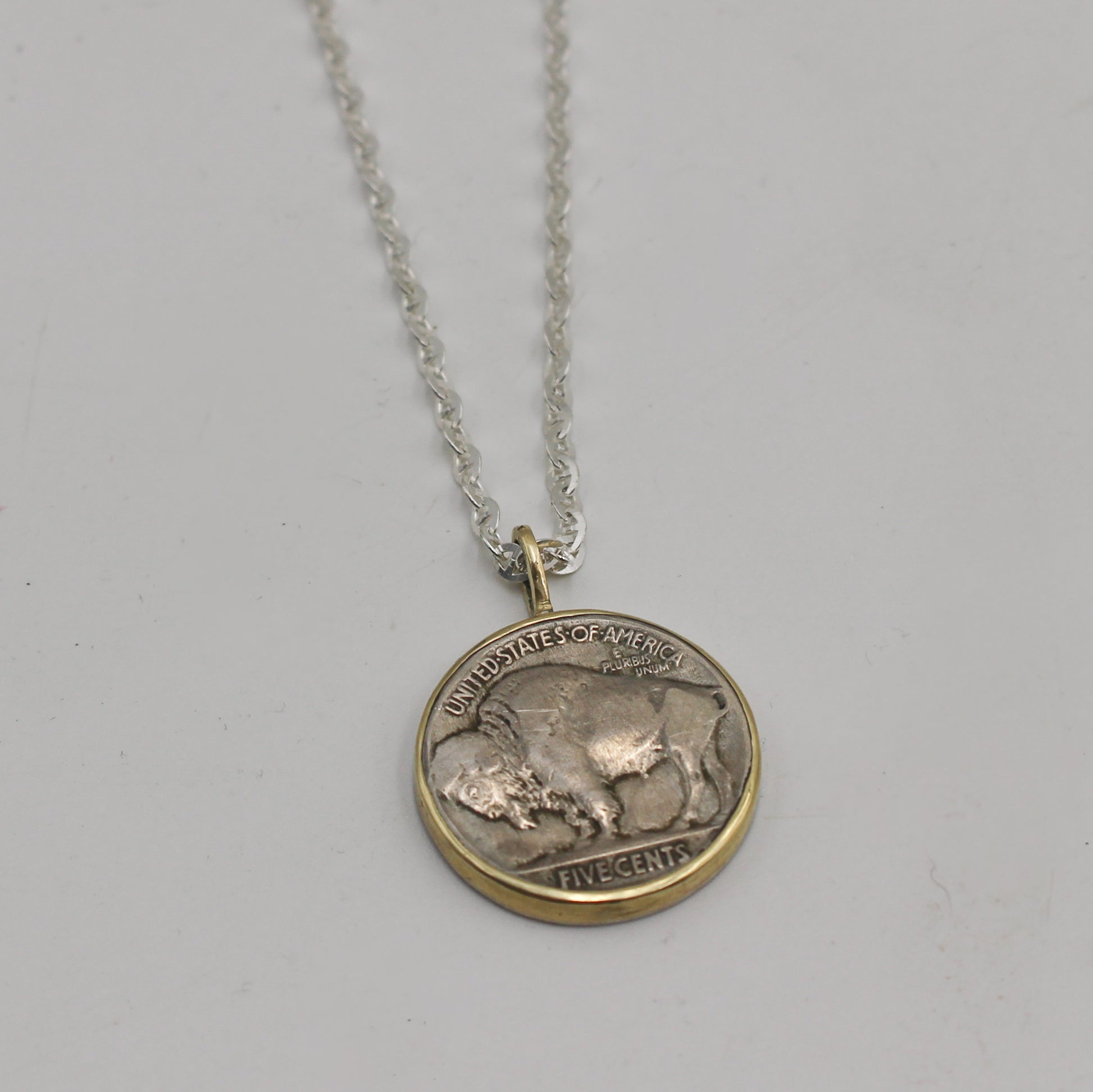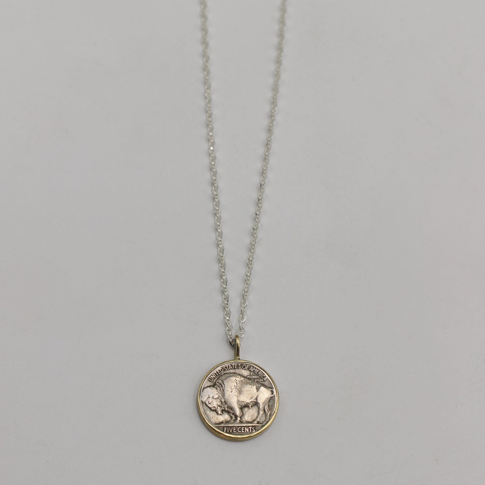 Your new lucky charm. 1935 vintage buffalo nickel set in a 10k gold bezel with a sterling silver backplate showing the reverse side of the coin; comes with a 24" sterling silver anchor chain