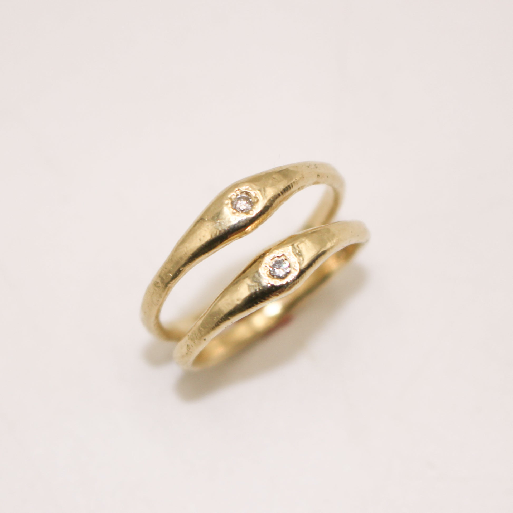 Hand-carved and cast in 10k yellow gold. Complete with a diamond set into the top and distressed texture.