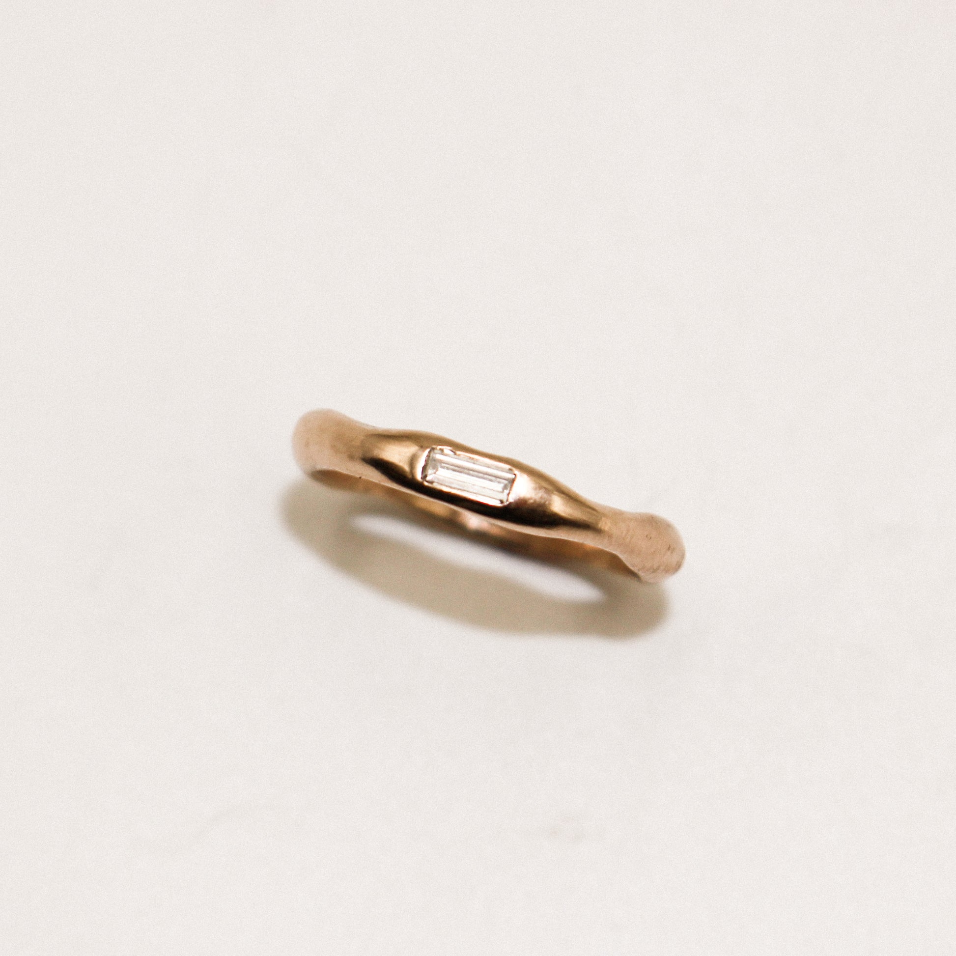 Hand-carved organic band cast in solid 14k rose gold with a flush set baguette diamond.