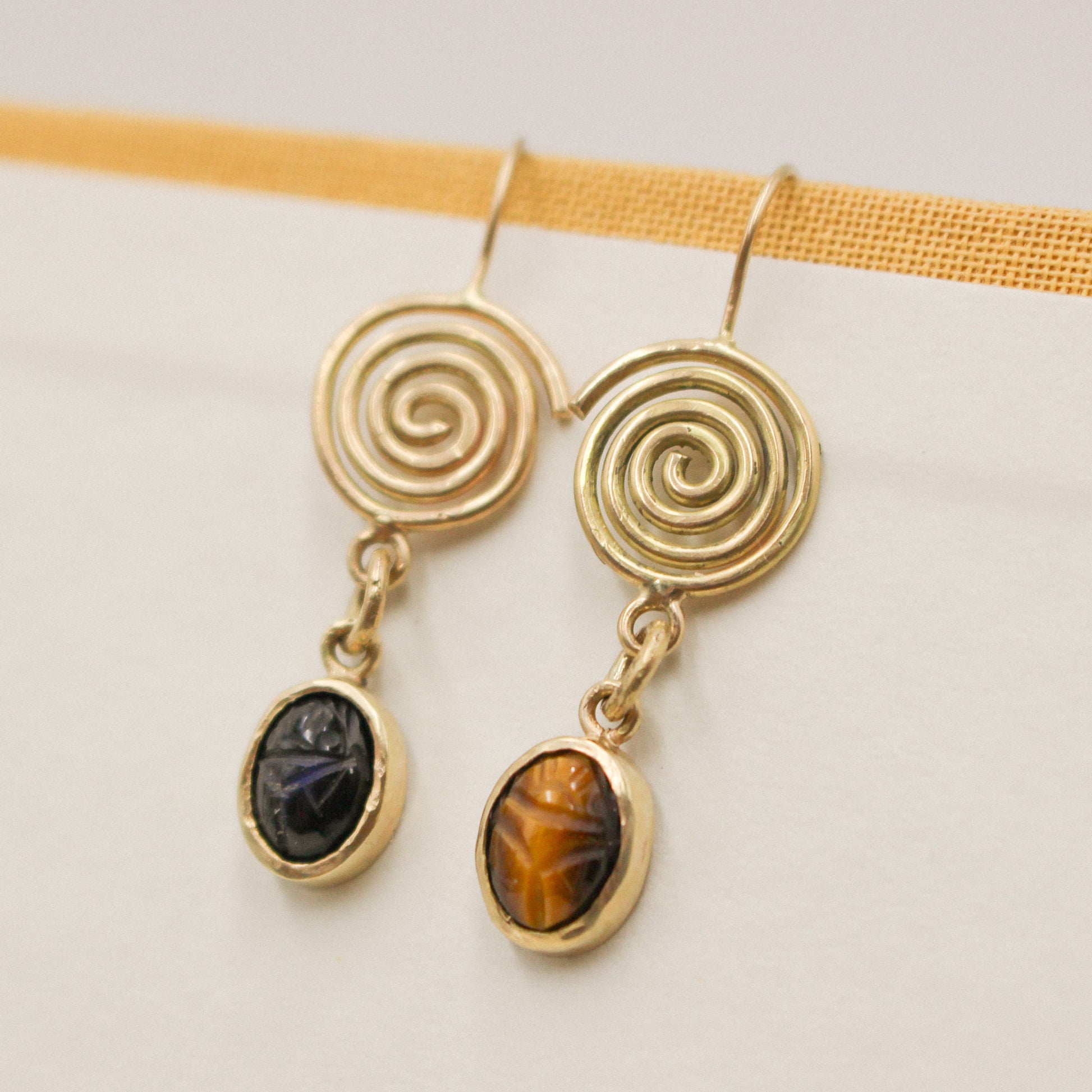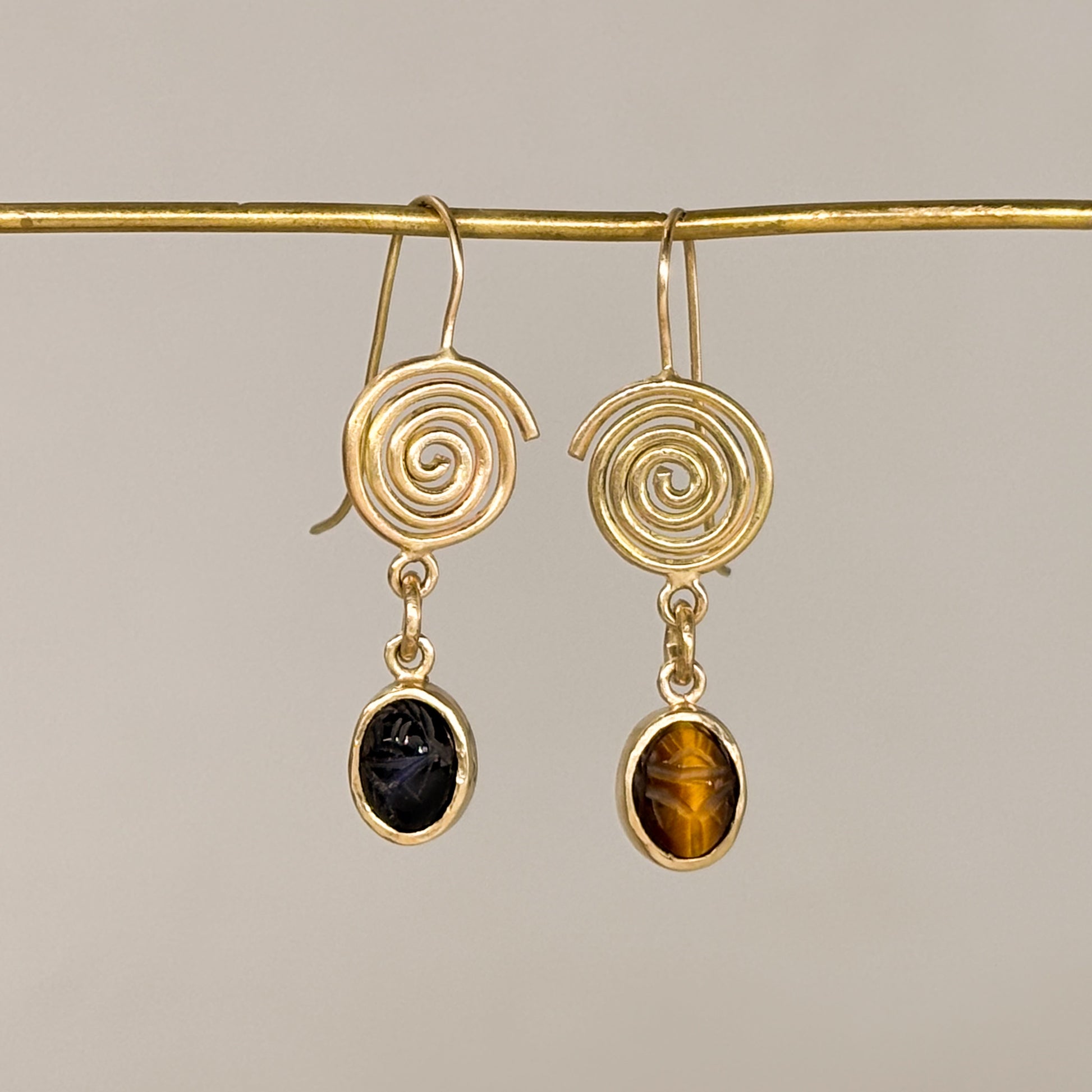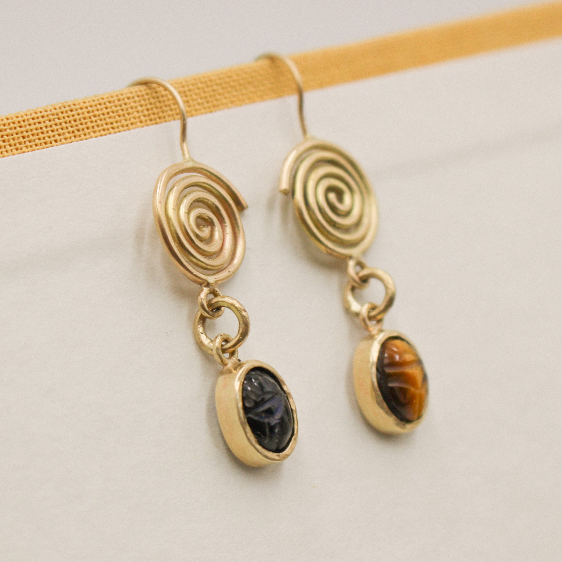 Ancient-inspired earrings, crafted in 14 karat gold, with mirroring spirals and carved vintage scarab stones. One of a kind.